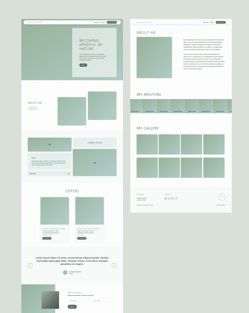 Our wireframes for Forest Floor Mindfulness illustrate a clean and intuitive layout. Each element is strategically placed thinking about how to introduce Lisa, her values and her offerings. .